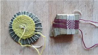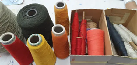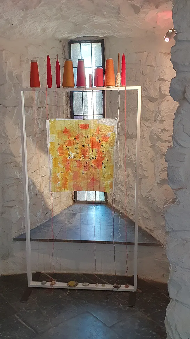 Acryl auf Papier ca. 50×50 / Garnrollen + Garn, Steine, Gestell